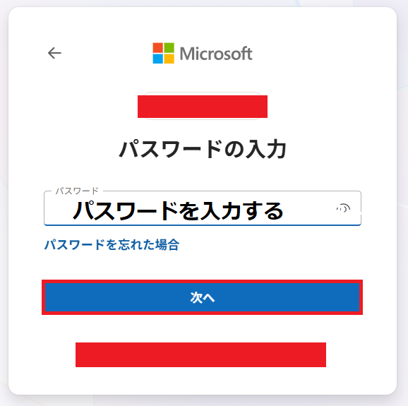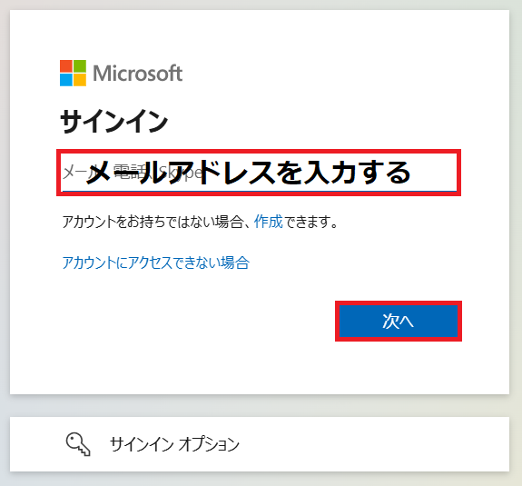 - Microsoft アカウント(例:○○@outlook.com)でログイン